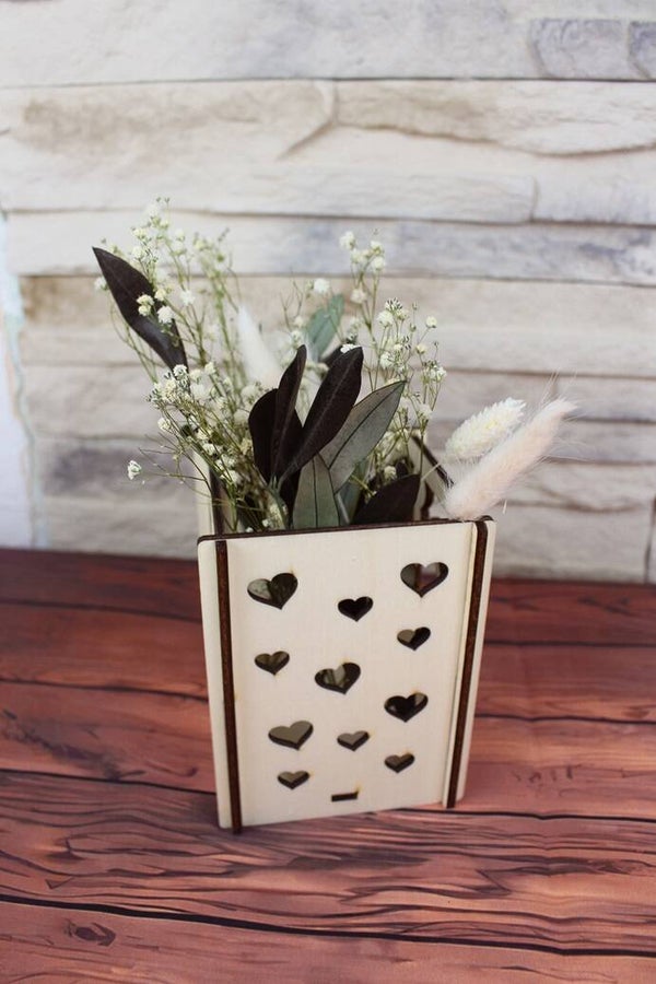 Das Windlicht besteht aus 4mm dicken Pappelsperrholz. Es ist 10cm breit und 13cm hoch. Du kannst aus zwei verschiedenen Wunschtexten wählen.