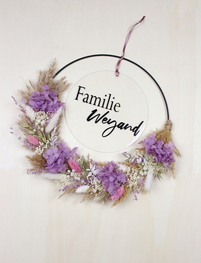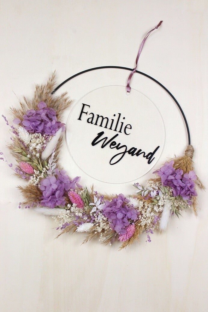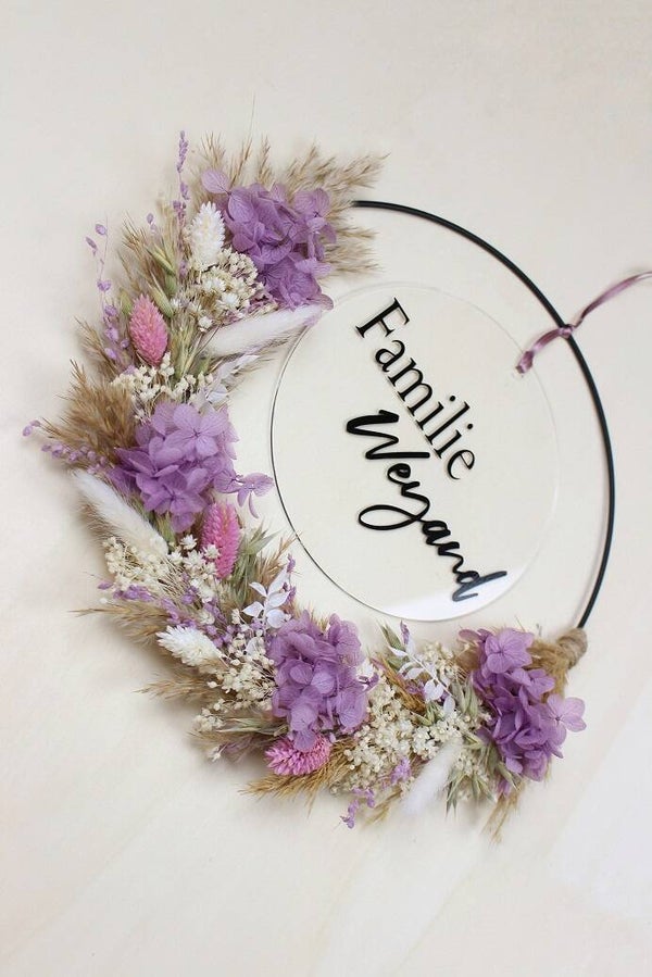 Unser handgefertigter Trockenblumenkranz mit personalisierter Acrylscheibe ist die perfekte Ergänzung, um deine Eingangstür aufzuwerten. (Er mag es überdacht)